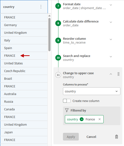 The search and replace step that was in the 11th place, is now in the 10th place, and this time, all occurrences of France including ones with typos, are displayed in upper case.