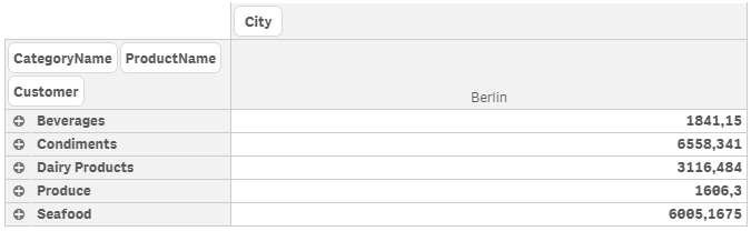 - City is a top dimension (according to the inter column sort order (qInterColumnSortOrder ) and the number of left dimensions (qNoOfLeftDims)).