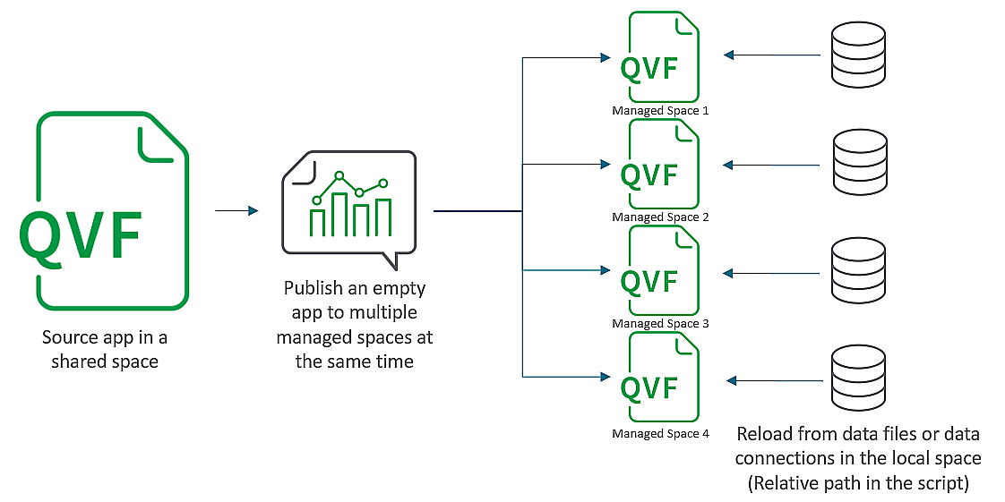 L'exemple suivant montre l'application principale stockée dans un espace partagé. Une application vide est publiée dans les espaces gérés 1 à 4. Les espaces gérés peuvent avoir des fichiers de données locaux ou des connexions de données locales à partir desquels ils peuvent effectuer des chargements. Lorsque de nouvelles données sont disponibles, l'application principale est chargée et les applications associées sont mises à jour via l'ajout des dernières données.