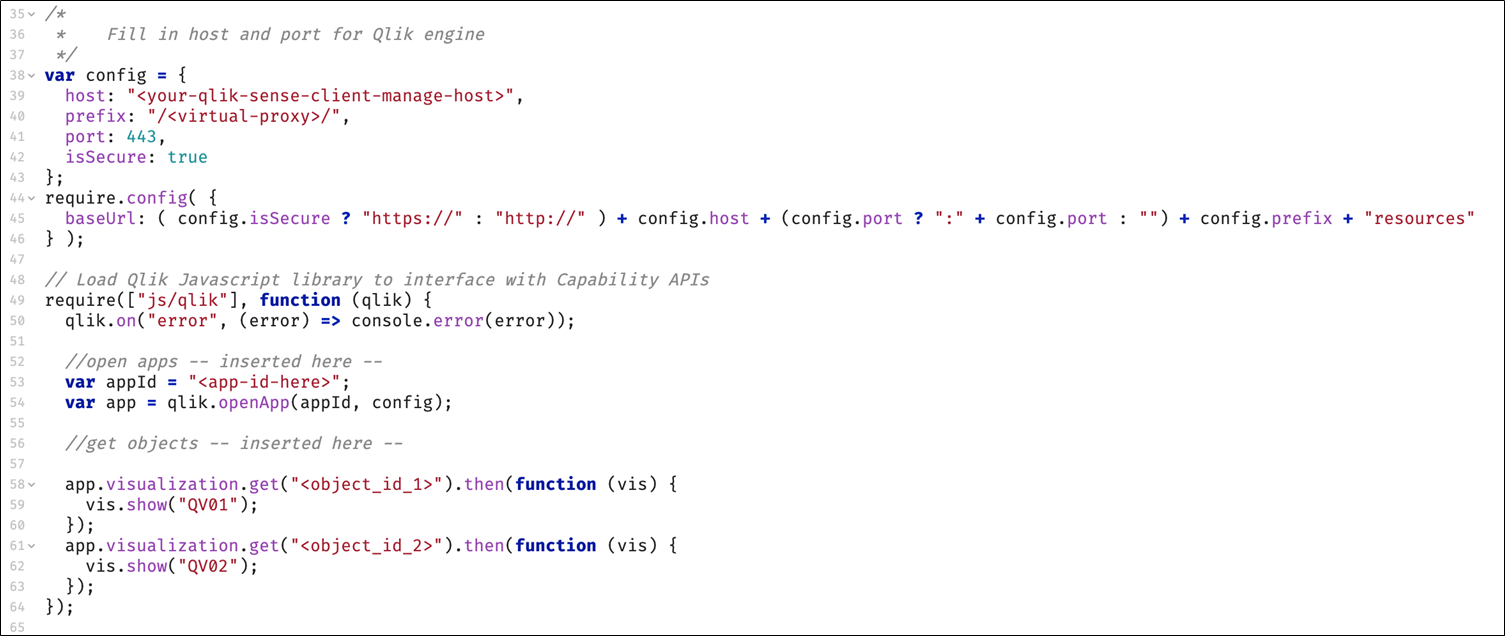Si votre application composite Qlik Sense Client-Managed utilise des API de fonctionnalités pour incorporer et interagir avec des objets dans Qlik Sense Client-Managed, examinez le code suivant, qui, dans cet exemple, incorpore plusieurs visualisations via la bibliothèque d'API de fonctionnalités Qlik.