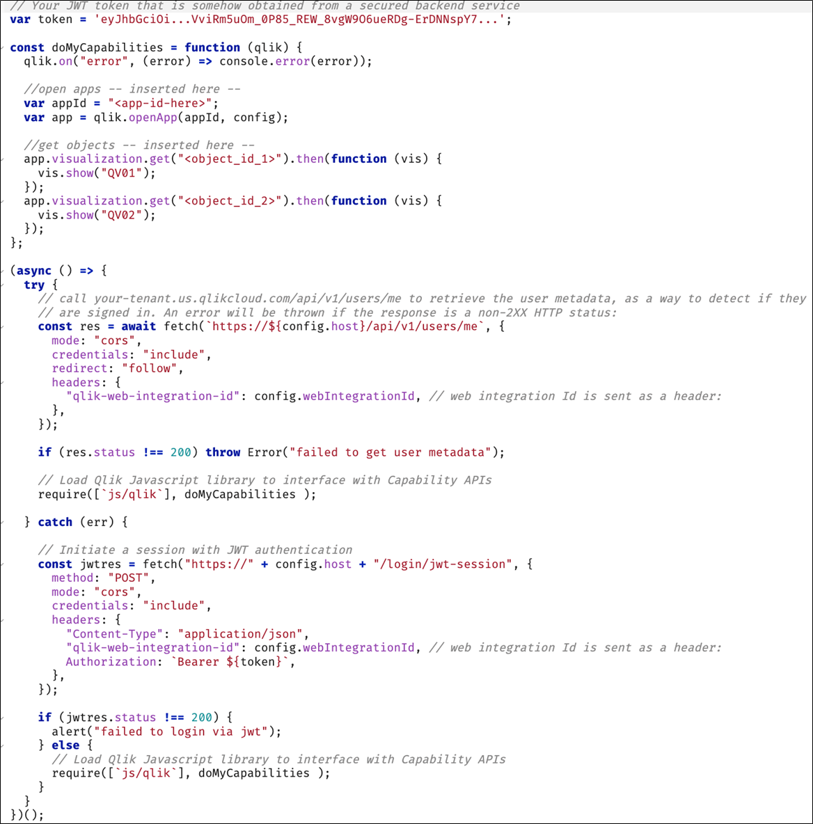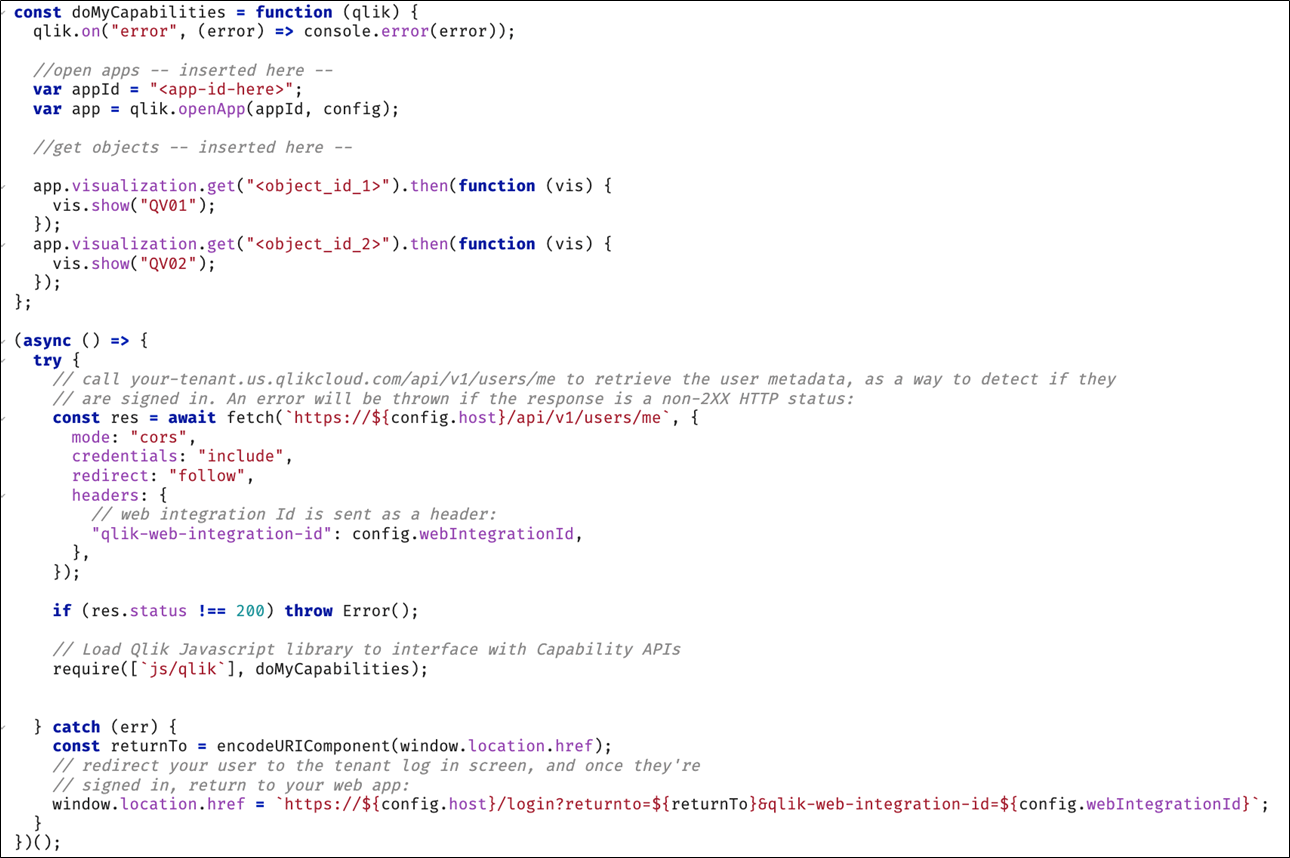 Avant de charger la bibliothèque d'API de fonctionnalités Qlik avec require (js/qlik), vérifiez si l'utilisateur est déjà connecté. Vous pouvez le faire, par exemple, en déclenchant un appel d'API REST pour le point de terminaison de métadonnées utilisateur existant. Si le statut de la réponse n'est pas 200, le code doit rediriger vers l'écran de connexion, injectant deux paramètres dans l'URL : returnto (l'URL de votre application composite en question) et qlik-web-integration-id.