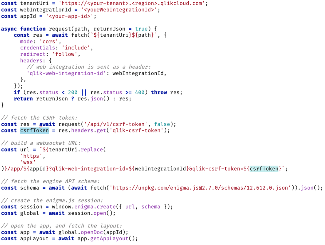 Lors de l'utilisation de enigma.js dans votre application Web, dans votre code principal ou frontal, une connexion WebSocket est créée. Cela signifie qu'un jeton CRSF doit être inclus sous la forme d'un paramètre de la connexion WebSocket pour que la bibliothèque enigma.js puisse ouvrir une session sécurisée avec Qlik Cloud.