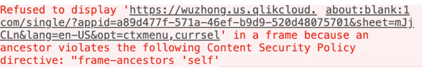 La stratégie CSP dans des blocs Qlik Cloud permet d'accéder à des objets Qlik depuis d'autres domaines. Cela signifie que lors de l'incorporation d'objets Qlik via l'approche Single API IFrame, vous recevrez l'erreur de stratégie frame-ancestors ‘self’.