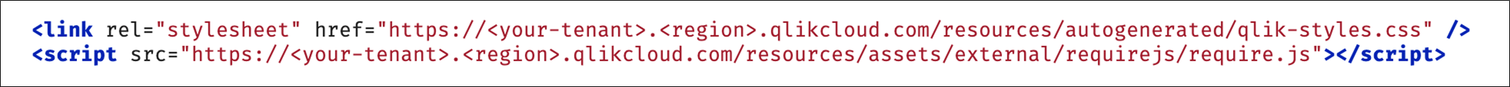 Comme avec votre application composite Qlik Sense Client-Managed, vous devez charger deux fichiers statiques Qlik dans la section <head> dans html (qlik-styles.css et require.js). Cependant, avec Qlik Cloud, ces fichiers sont directement accessibles sans aucune authentification requise.
