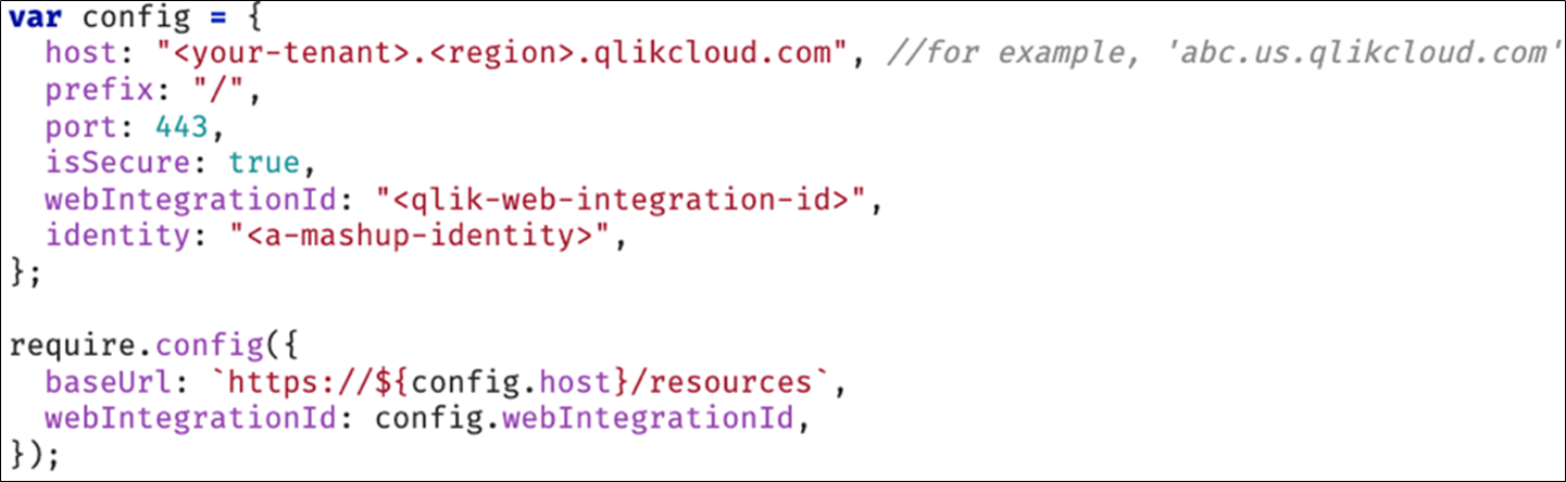 La configuration require doit contenir votre webIntegrationId, et baseUrl est plus simple, car les communications vers Qlik Cloud s'effectuent toujours via https sur le port 443.