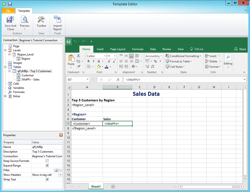 Cette section ne traite pas de toutes les opérations qu'il est possible d'effectuer dans Qlik NPrinting Designer. Si vous souhaitez en savoir plus sur les fonctions de rapport Excel avancées, voir : Rapports Excel (uniquement en anglais).