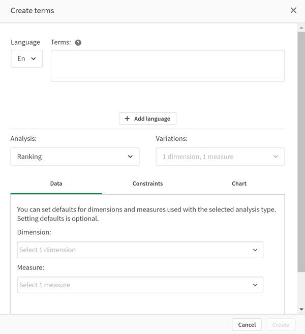 При создании пользовательского анализа в него добавляются термины, а затем выбирается тип анализа. Затем можно указать измерения или меры по умолчанию. Если значения по умолчанию не заданы, Инструмент «Наблюдения» определяет соответствующие измерения или меры для использования в анализе на основе вопроса.