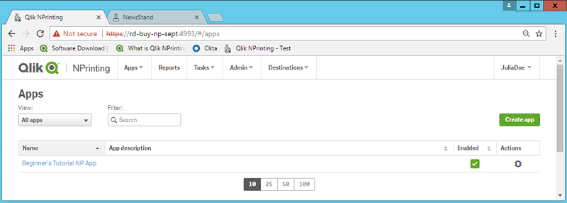 - 确保选中启用复选框。否则,您的应用程序将被 Qlik NPrinting Engine 忽略。