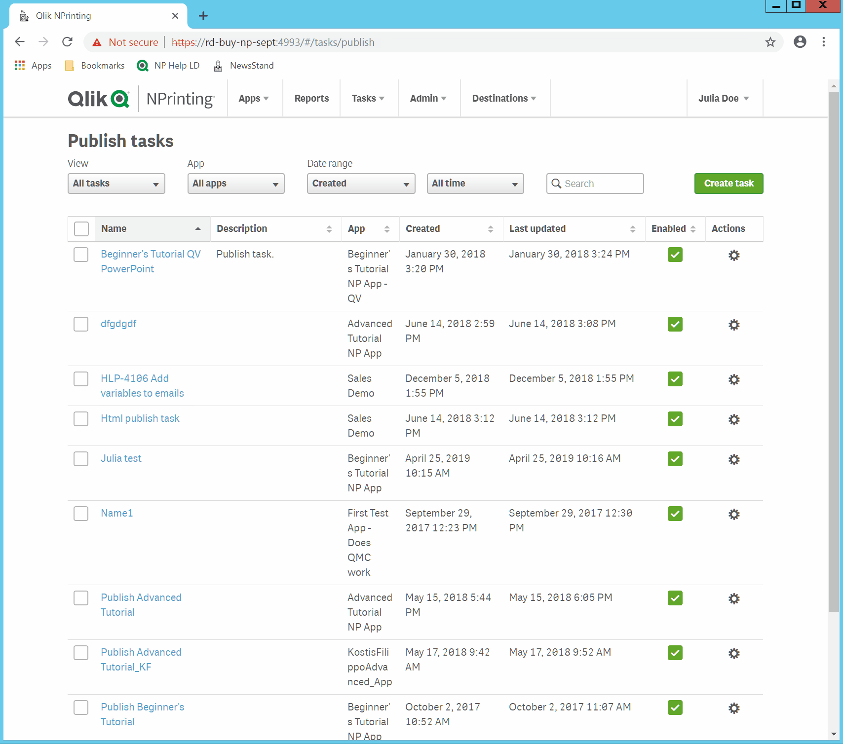 - 在 Qlik NPrinting Web 控制台中,单击主菜单上的任务,然后选择发布任务。